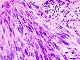 ![]() Патогистологическая картина гастроинтестинальной стромальной опухоли желудка. Окраска гематоксилином-эозином. | |