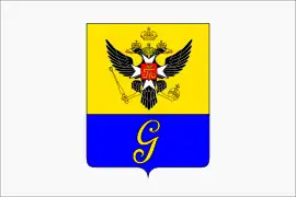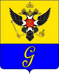 Описание герба: "Щит пересечён. Вверху, в золотом поле, российский государственный двуглавый орёл времён правления императора Павла I; чёрный с золотыми клювами и лапами, с червлёными (красными) языками, увенчанный тремя императорскими коронами, из которых средняя больше, с золотыми скипетром и державой в лапах, с серебряным мальтийским крестом под короной Великого магистра Державного ордена святого Иоанна Иерусалимского (Суверенного военного Мальтийского ордена) на груди; поверх креста положен червлёный щиток, обременённый золотым вензелевым именем Павла I под императорской короной. Внизу, в лазоревом (синем, голубом) поле золотая литера «G»"[43].