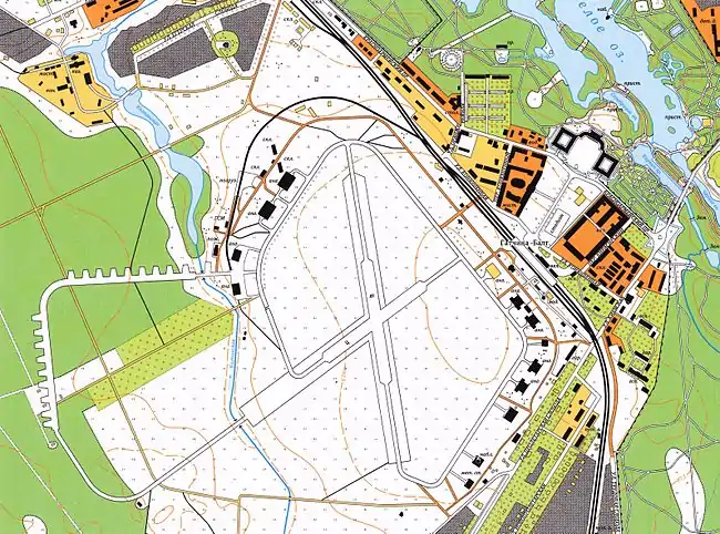 В 1930-е годы на аэродроме базировалась 1-я авиабригада, самолёты И-15, Р-5, И-153, ТБ-1, И-16, СБ. Для тренировок парашютистов в это время была предоставлена Сигнальная башня Дворца — для использования в качестве парашютной вышки. Сам аэродром был огорожен колючей проволокой. Напротив Балтийского вокзала находился пост с караульным помещением. На территории аэродрома стояли 4 кирпичных ангара, имевшие с двух сторон четырёхстворчатые ворота, убиравшиеся при открытии справа и слева в арочные аванворота. От ангаров шли выводные рулежные дорожки. Поле имело две взлетно-посадочные полосы, расположенные крестообразно; использовались они в зависимости от направления ветра. Взлетно-посадочные полосы с искусственным покрытием (ИВПП), имевшие длину 500 м каждая, были выложены квадратными и шестигранными цементобетонными плитами. Летное поле имело систему водоотвода. С появлением самолетов-бомбардировщиков на северо-западной окраине лётного поля были построены два больших арочных ангара, в которых размещались самолеты СБ. Ангары и летное поле обслуживала специальная аэродромная команда (прообраз аэродромно-эксплуатационной роты). На южной окраине лётного поля находилась метеостанция. Новые большие ангары были построены на северо-западной окраине поля. У железнодорожной ветки находился склад ГСМ. Склад боеприпасов, окружённый земляным валом, располагался на улице Пограничной[9].