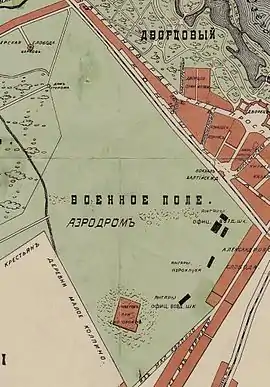 Кроме ангаров на 10-12 самолетов, на окраине аэродрома вырос небольшой городок с мастерскими, бензохранилищем, импровизированной метеостанцией, служебными помещениями. Были четко обозначены взлетно-посадочная полоса и место для «катания» — для обучения будущих пилотов рулению аэроплана на земле. В архивном деле № 103 фонда 298 ЦГВИА к материалам о гибели поручика М. Н. Нестерова (брата поручика Нестерова П. Н.) на аэроплане «морган» приложена схема аэродрома, на которой основная взлетно-посадочная полоса изображена вдоль Балтийской железной дороги, но обозначены возможные направления взлета на Егерскую слободу и в других направлениях. Аэродром фактически принадлежал временному отделу Офицерской воздухоплавательной школы, который сначала существовал как её подразделение.