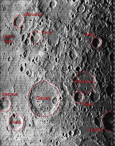 - Образование сателлитного кратера Гаусс C относится к позднеимбрийскому периоду[1].