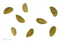 Плод — ярко-жёлто-оранжевая коробочка с чёрными семенами.