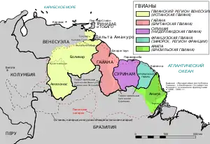 - Гайана (ранее — Британская Гвиана) — государство, расположенное между Гайанскими горами и рекой Корантейн