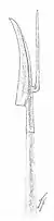 Первый клинок, прямой и длинный, служил для поражения врага, в первую очередь кавалериста, а вторым искривлённым клинком перерезали сухожилия у лошади противника или стягивали всадника с лошади.