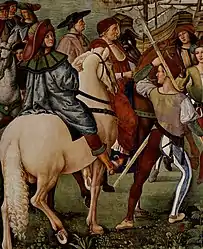 Сдача Парижа в 1420 году. Миниатюра из «Вигилий на смерть короля Карла VII» (1483). Второй воин слева вооружён гизармой.