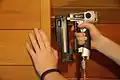 - При нажатии на спусковой крючок сжатый воздух перестает поступать в крышку. Клапан в ней пропускает воздух в камеру инструмента, и давление толкает боек вперед, забивая гвоздь.
