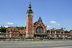 Вокзал построен в стиле так называемого «Гданьского ренессанса», являющимся эклектичным сочетанием архитектурных форм эпохи Возрождения и барокко (историзм). Здание вокзала и башня были построены из кирпича и богато украшены песчаником из Вартковице.