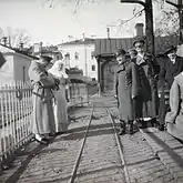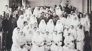 | Персонал Царскосельского госпиталя. В центре — В. И. Гедройц. | Во дворе госпиталя. Слева А. Вырубова, справа В. И. Гедройц. | В. И. Гедройц оперирует. Ассистируют императрица с дочерьми. | В. И. Гедройц наблюдает за перевязкой раненого великой княжной Татьяной Николаевной. |