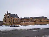 | 3 | Церковь с церковным убранством, дом I, дом II, дом III, дом IV (больница), кухня, прачечная, дымоход на территории бывшей тюрьмы Баутцен I | Kirche mit Kirchenausstattung, Haus I, Haus II, Haus III, Haus IV (Krankenhaus), Küche, Wäscherei, Schornstein | 1900 — 1904 | Breitscheidstraße 4 | 09250715 | ![]() |