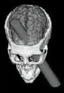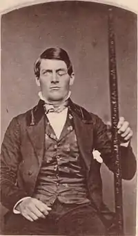 Финеас П. Гейдж (англ. Phineas P. Gage; 1823—21 мая 1860 года) — американский строитель, получивший тяжёлое ранение головного мозга при прокладке железной дороги. В 1848 г., когда он работал бригадиром взрывников на прокладке железной дороги в Вермонте, лом, которым он уплотнял пробку над использовавшимся при взрывных работах пороховым зарядом, высек искру и вызвал взрыв. Металлический стержень диаметром 1,25 дюйма (3,2 см) вошёл в череп Гейджа ниже левой глазницы, выходное отверстие раны располагалось на границе лобной и теменной костей также с левой стороны. Из-за ранения строитель лишился большей части лобной доли левого полушария головного мозга. Несмотря на столь тяжелые повреждения, пострадавший пришёл в сознание спустя несколько минут после травмы и уже через два месяца смог вернуться к активному образу жизни[1]. В конце концов он оправился от инфекции, развившейся в ране, и прожил ещё 12 лет.