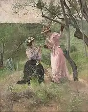 С этих пор произошла перемена в направлении и манере его живописи: бросив историко-бытовые сюжеты, он превратился в плэнериста. Буживаль и берега Сены с её канотьерами и канотьерками, а отчасти и заготовленные в Лондоне этюды стали доставлять ему благодатный материал для прелестных, веселых картинок, полных воздуха и света, а также для еще более мастерских акварелей. Из числа подобных произведений особенную похвалу со стороны художественной критики заслужили: "Хорошая погода", "Lawn-Tennis", "Рекомендация", "Канотьеры в Буживале", "Летнее веселье", "Встреча", "Воспоминание о Темзе" и некоторые другие[1].