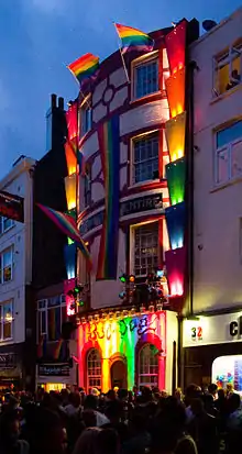 Лондонское ЛГБТ-сообщество исторически было сосредоточено вокруг Сохо с 18-го века и, в частности, Олд-Комптон-стрит, где теперь вдоль улиц расположены бары, клубы, рестораны, кафе, магазины и театры[48]. Также популярен Воксхолл, известный в просторечии как Вохо, с барами, ночными клубами и сауной, а также старинной таверной «Royal Vauxhall» и «Above The Stag Theater», единственным ЛГБТ-театром Великобритании[49]. В последнее время заведения в Долстоне, Шордитче и Бетнал Грин стали популярными среди членов ЛГБТ-сообщества[49]. Фронт освобождения геев в Великобритании зародился в Лондоне в 1970-х годах, что положило начало первому официальному митингу гей-прайдов в Великобритании в 1972 году.[50]. Лондонский прайд проходит в центре города в конце июня, уделяя особое внимание главной сцене на Трафальгарской площади и площадкам в Сохо и Воксхолле. Прайд — единственное ежегодное мероприятие, закрывающее лондонский Оксфорд-стрит, ежегодно собирающее тысячи зрителей[51]. В 2014 году более 750 000 человек посетили Лондонский гей-парад[52]. Согласно отчёту Национальной статистической службы 2010 года, в Лондоне проживает самый высокий процент британцев, идентифицирующих себя как представителями ЛГБТ-сообщества, чем где-либо ещё в Великобритании — 2,5 %[53]. ЛГБТ-организации города включают London Lesbian and Gay Switchboard и OutRage!. Stonewall, основанная в 1989 году, в настоящее время является крупнейшей в Великобритании благотворительной ЛГБТ-организацией[54] и располагается в Лондоне. Благотворительные организации по борьбе с ВИЧ и СПИДом Terrence Higgins Trust и National AIDS Trust базируются в Лондоне, как и PinkNews, популярное интернет-издание для ЛГБТ-сообщества. Национальные ЛГБТ-журналы Gay Times, Attitude и DIVA размещены в пригороде, тогда как публикации QX, Boyz, So So Gay, Out in the City распространяются исключительно в столице.