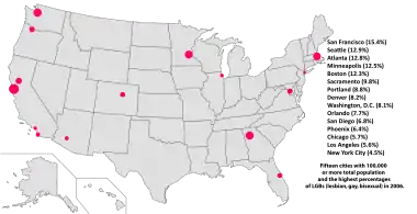 Наиболее населённый меньшинствами город США — это Нью-Йорк, где проживает около 272 493 геев[86]. На втором месте Лос-Анджелес (154 270), за ним следуют Чикаго (114 449) и Сан-Франциско (94 234).