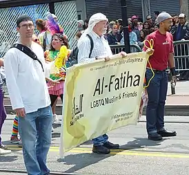 В гей-парадах принимают участие и общины различных либеральных направлений иудаизма[105][106][119], таких как реформистский[120] и реконструктивистский[121], и иудейские ЛГБТ-организации, как, например, Международный конгресс ЛГБТ-иудеев (World Congress of Gay, Lesbian, Bisexual, and Transgender Jews: Keshet Ga’avah)[122]. Существует небольшое число ЛГБТ-принимающих групп в либеральных движениях ислама, которые также участвуют в гей-парадах, например, «Аль-Фатиха» и «Мусульмане за прогрессивные ценности» (Muslims for Progressive Values)[123].