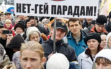 Оживлённые дискуссии со стороны представителей власти, прессы, общества в целом, а также внимание мировой общественности вызвали правозащитные акции Московского гей-прайда, которые с мая 2006 года ежегодно проводятся в Москве правозащитным проектом GayRussia.Ru[2]. В 2008 году движение Московского гей-прайда объединилось с белорусскими ЛГБТ-активистами, учредив совместный Славянский гей-прайд, мероприятия которого проходят в Москве и Минске. В 2010 году к российскому движению гей-прайда присоединились ЛГБТ-активисты из Петербурга, впервые проведя Санкт-Петербургский ЛГБТ-прайд[3].