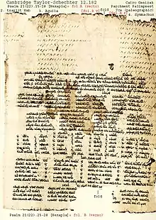 В 1900 году Чарльз Тейлор опубликовал сильно повреждённый фрагмент палимпсеста, происходящего из Каирской генизы. Текст имел, как минимум, три слоя: под раннесредневековыми записями на иврите просматривалась позднеантичная литургическая поэма и унциальный текст Гексаплы примерно VIII века: огласовка Псалма 22 греческими буквами и фрагменты его перевода — Акилы, Симмаха, Семидесяти и Феодотиона — именно в таком порядке[27]. Тейлор предположил, что изначально текст на листе был переписан в 40 строк (сохранилось 33), причём на каждой из них точно помещались греческие эквиваленты соответствующих еврейских слов. В 1994 году Р. Дженкинс заново исследовал фрагмент листа Гексаплы и подтвердил, что изначально текст был переписан в 40 строк, предположив, что еврейский текст квадратным письмом не был скопирован в этой рукописи[27].