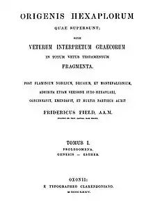 - Origenis Hexaplorum quae supersunt; sive, Veterum interpretum Graecorum in totum Vetus Testamentum fragmenta. Post Flaminium Nogilium, Drusium, et Montefalconium, adhibita etiam versione syro-hexaplari, concinnavit, emendavit, et multis partibus auxit Fridericus Field. — Oxonii : E typographeo Clarendoniano, 1875. — Т. I. Prolegomena. Genesis — Esther. — 806 p.