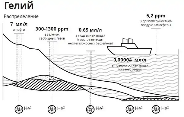 - Гелий — благородный газ, в силу химической инертности не сорбируется породами и не образует соединений с другими химическими элементами.