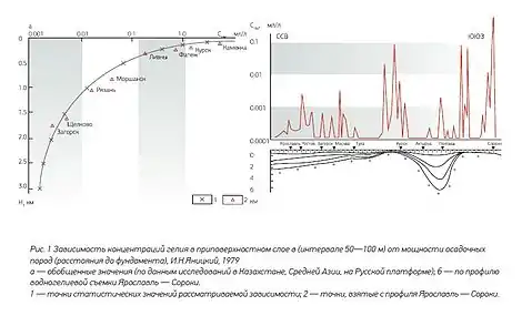 - Распределение стационарного потока гелия в осадочном чехле, определяется близостью (рис. 1), возрастом фундамента, мощностью осадочного чехла и общей его проницаемостью, то есть наличию глубинных разломов (рис. 2).