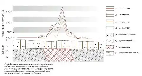 - По мере удаления от фундамента концентрация и парциальное давление (упругость) гелия в разрезе уменьшаются.