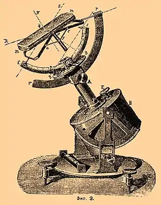 Часовой механизм коробки B вращает около оси, устанавливаемой параллельно оси мира, стержень AOC, который можно направить параллельно лучам солнца с помощью дуги f, циферблата и визира, устроенных как в гелиостате Зильбермана: само зеркало снабжено «хвостом» ЕС, направленным нормально к его плоскости. Хвост этот составляет одно целое с кружком, вращающимся около горизонтальной оси относительно вилки, которая, в свою очередь, вращается свободно около вертикальной оси Н. Таким образом, зеркало может поворачиваться около точки Е во все стороны; сверх того, оно вращается ещё в своей плоскости относительно кружка и хвоста. Центр О дуги f должен быть расположен на одной вертикальной с центром круга KL, a длина OE должна быть аккуратно равна расстоянию ОС. В таком случае треугольник ОСЕ будет оставаться равнобедренным во все время движения часового механизма и при всех возможных положениях основания зеркала на круге KL; поэтому угол падения SEN будет оставаться равным углу отражения NER и отраженный луч ER не изменит своего начального положения. Пластинка с разрезом, охватывающая конец А стержня СОА и прикрепленная к зеркалу, имеет целью направлять наибольшую длину этого последнего параллельно плоскости отражения лучей, чтобы сохранить достаточную ширину отраженного пучка света. На широте Петербурга оба вышеописанные гелиостата действуют удовлетворительно только летом; зимой же солнце так мало поднимается над горизонтом, что их механизмы или вовсе нельзя привести в надлежащее положение, или же они начинают действовать неправильно, потому что в суставчатых системах неизбежный зазор в сочленениях и точках скольжения оказывает наибольшее влияние на положение членов, когда направления этих последних пересекаются под малыми углами. Механизм, удерживающий луч светила в постоянном направлении, может быть употребляем и для наблюдения этого светила вместо самодвижущихся установок зрительных труб, употребляемых астрономами. Такой прибор, названный сидеростатом, был осуществлен в разное время Физо и Фуко, Лосседа и Монкговеном, но довольно неуспешно. Благодаря трудам Фуко найдены методы для получения безукоризненно правильных стеклянных зеркал, посеребренных на наружной поверхности и не искажающих отраженное изображение, пока зеркало в покое; но дрожания, производимые ходом часового механизма, портят всё дело. Не много помогла и замена обыкновенного часового механизма со спуском, дающим равномерно периодическое движение и употребляемого в гелиостате, механизмом с регулятором Фуко для плавного, равномерного движения. Лучшим сидеростатом служил ручной гелиостат Толлона, исполненный Готье, где большое правильное зеркало приводилось в движение около вертикальной и горизонтальной оси, с помощью бесконечных винтов и шнурков, самим наблюдателем.