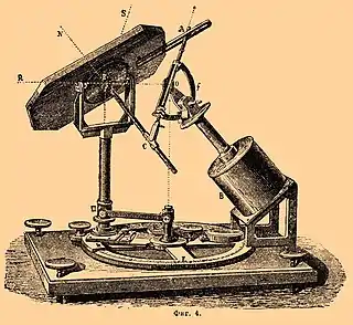 Часовой механизм, помещенный в коробке H, вращает всю дугу cs вокруг оси F, параллельной оси шара, а рамки, поддерживающие зеркало, вращаются около осей Со и or; поэтому нормаль oN к зеркалу сама собой остается всегда в плоскости обоих лучей и движение продолжается свободно во все время дня, от восхода до заката. С помощью дуги наклон оси устанавливают по широте места наблюдения, потом винтом D завинчивают cs так, чтобы указатель стоял на делении, обозначающем месяц и число дня наблюдения, причём на другой поверхности этой дуги нониус покажет соответственный угол склонения солнца. Тогда останется поставить стрелку циферблата ВВ на истинное время наблюдения, пустить в ход механизм и поворачивать весь прибор около вертикальной оси его основания, пока луч, проходящий через дырочку визира s, не упадет на середину пластинки p. Направить отраженный луч на желаемое место можно, передвигая дугу rr' и поворачивая её плоскость около оси мира при посредстве винтов А и Е. Недостаточная прочность частей гелиостата Зильбермана, висящих частью на главной оси часового механизма, и малые размеры направляющего четырёхугольника не допускают помещения большого зеркала, и мешают полной правильности движения. В гелиостате Фуко (см. рисунок 4) зеркало опирается на особую, прочную подставку и поэтому может быть взято произвольных размеров.