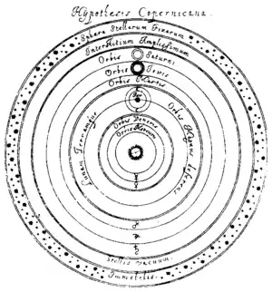 По всей видимости, у Коперника сохранялась вера в существование небесных сфер, несущих на себе планеты. Таким образом, движение планет вокруг Солнца объяснялось вращением этих сфер вокруг своих осей[36].