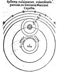 В Средние века гелиоцентрическая система мира была практически забыта. Некоторую известность получило представление, что Меркурий и Венера обращаются вокруг Солнца, которое, в свою очередь, вращается вокруг Земли[20][21]. Вероятно, средневековые авторы узнали об этой теории из сочинения латинского автора первой половины V века Марциана Капеллы «Брак Меркурия и Филологии», пользовавшегося большой популярностью в раннем средневековье.