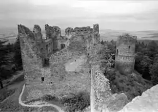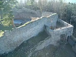 | Цилиндрической башня в северо-восточном углу замкового ядра | Внешние ворота замка | Каменная доска с гербами Яна I из Рожмберка и его жены Элишки из Галса, XIV век | Руины проездной башни с третьими воротами в северо-западном углу замкового ядра |