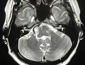 ![]() Аксиальная МР-томограмма. Конфликт артериального сосуда с правым лицевым нервом. Клиническая картина: правосторонний гемифациальный спазм. | |