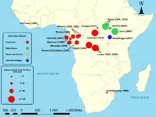 - Раз в несколько лет происходят вспышки в Конго и Уганде (Центральная Африка)[33][34]. Например, в июле 2012 года 14 человек скончались в Уганде в результате заражения вирусом[35].