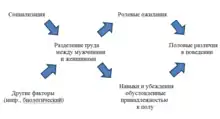 Она говорит о том, что разные факторы, такие как, например биологические, и социализация в детстве являются причиной разделения труда между мужчинами и женщинами. Во взрослой жизни человека роли, отражающие межполовое разделение труда, становятся основой для гендерных различий. Женщины склонны исполнять роли, направленные на внимание и заботу к людям, а мужчины — где можно проявить свою физическую силу и лидерство.[4]