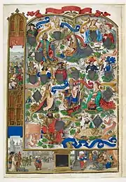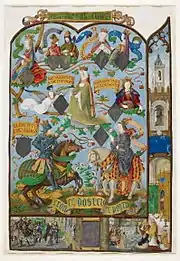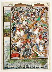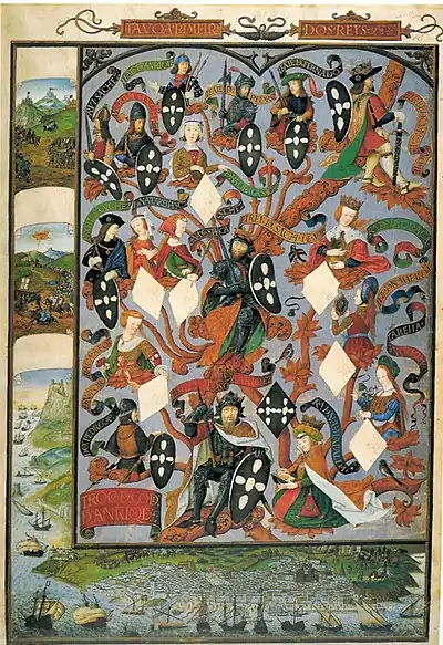 | Генеалогическое древо графа Генриха (Энрике) Бургундского, предка всех королей Португалии, описывающее его легендарное происхождение от короля Венгрии Иштвана Святого (Стефана Великого).[K 3] Надпись вверху «TAVOA 1A». | Генрих (Энрике) Бургундский и его жена Тереза Леонская — Иштван I Святой и его жена Гизела Баварская — Геза и его жена Шарольт — Генрих II Баварский и его жена Гизела Бургундская | Слева — войско осаждает город.