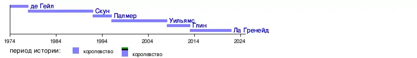 | 2 | ![]() | Сэр[1] Пол Годвин Скун (1935—2013) англ. Paul Godwin Scoon | 30 сентября 1978 | 6 августа 1992 |