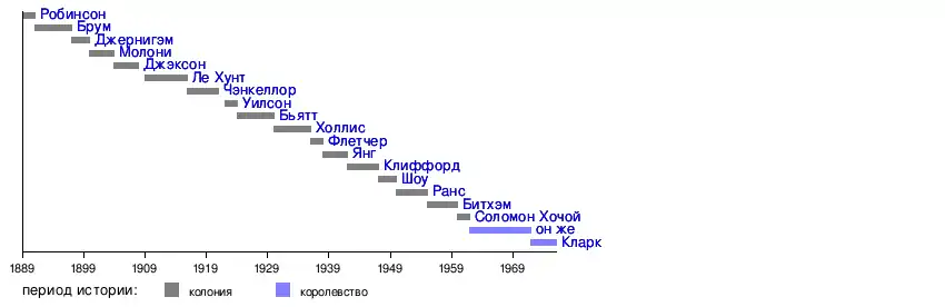 | 1 | ![]() | Сэр Соломон Хочой (1905—1983) англ. Solomon Hochoy | 31 августа 1962 | 15 сентября 1972 |