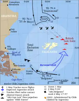 1 мая подводная лодка приблизилась к аргентинской опергруппе, продолжая оставаться незамеченной. На этот момент аргентинские корабли находились за пределами 200-мильной (370 км) военной зоны, объявленной Великобританией (и было сделано официальное заявление о том, что любой аргентинский корабль в этой зоне будет потоплен). Несмотря на это, британцы сочли группу представляющей угрозу для своего флота. После консультаций с министрами своего кабинета Маргарет Тэтчер лично отдала распоряжение об атаке на корабли противника.