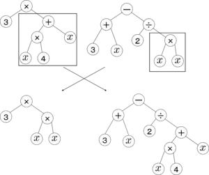 В древовидном представлении оператор скрещивания реализуется обменом между двумя деревьями какими-либо узлами вместе с их потомками (поддеревьями).