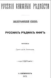 - Русские книжные редкости: Библиогр. список рус. ред. кн. / Сост. Григорий Геннади. — Санкт-Петербург: тип. А. Траншеля, 1872. — [6], IV, 150, [3] с.