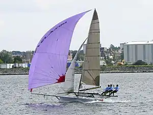 Геннакер (от слияния терминов англ. genoa (sail) и англ. spinnaker) — (иногда называемый асимметричным спинакером, реже называемый блистером) в большинстве случаев может служить альтернативой спинакеру. Впервые появился в Австралии в 1980-х годах[1]. По площади геннакер больше генуи, но меньше спинакера. Геннакер — парус с высоким шкотовым углом, его галсовый угол крепится к палубе на носу яхты или бушприту. Такой парус хорошо работает в широком диапазоне курсов — от галфвинда до фордевинда.