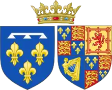Щит увенчан короной, соответствующей достоинству французских принцев — королевских детей. Справа — герб герцогов Орлеанских (французский королевский герб — в лазоревом поле три золотых лилии — с серебряным титлом с тупыми зубцам); слева — английский королевский герб Стюартов (начетверо: в первой и четвёртой частях королевский герб Англии [в 1-й и 4-й частях в лазоревом поле три золотых лилии (французский королевский герб), во 2-й и 3-й частях в червлёном поле три золотых вооружённых лазурью леопарда (идущих льва настороже), один над другим (Англия)]; во второй части в золотом поле червлёный, вооружённый лазурью лев, окружённый двойной процветшей и противопроцветшей внутренней каймой [Шотландия]; в третьей части в лазоревом поле золотая с серебряными струнами арфа [Ирландия])[53].