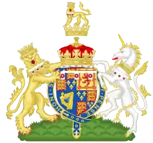 Щит четверочастный с серебряным турнирным воротником [титлом], зубцы которого обременены розой Тюдоров (червлёная роза с серебряной сердцевиной и зелёными листьями[59]): в 1-й и 4-й частях — английский королевский герб (начетверо: в 1-й и 4-й частях в лазоревом поле три золотых лилии [Франция]; во 2-й и 3-й частях в червлёном поле три золотых леопарда [идущих льва настороже], вооружённых лазурью, один над другим); во 2-й части — герб Шотландии (в золотом поле червлёный, вооружённый лазурью, восстающий лев, окружённый двойной процветшей и противопроцветшей внутренней каймой); в 3-й части — герб Ирландии (в лазоревом поле золотая с серебряными струнами арфа)[60].