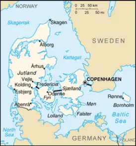 Дания расположена в Северной Европе (относится к Скандинавским странам) на полуострове Ютландия и нескольких островах Балтийского моря. Протяженность береговой линии двух морей — Балтийского и Северного составляет 7314 км. У Дании имеется только одна сухопутная граница протяженностью 68 км с Германией. Климат преимущественно умеренный, зима — мягкая и ветреная, а лето — прохладное. Рельеф преимущественно низменный с холмистыми равнинами[1]. Территория Дании включает остров Борнхольм в Балтийском море. Такое месторасположение дает Дании полный контроль над двумя Датскими проливами (Скагеррак и Каттегат), соединяющими Балтийское и Северное моря.