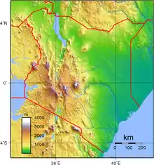 Высшая точка страны — гора Кения (5199 метров), это вторая по высоте после Килиманджаро точка Африки. Максимальная протяжённость территории Кении составляет 1131 км в направлении с юго-юго-востока на северо-северо-запад и 1025 км — с востоко-северо-востока на западо-юго-запад. Экватор пересекает территорию страны и делит её на две почти равные части.