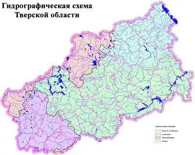 По территории области проходит водораздел Каспийского и Балтийского морей.[1] На юге Бельского района находятся верховья нескольких притоков реки Вопь, правого притока Днепра (бассейн Чёрного моря). К бассейну Каспийского моря принадлежит 70 % территории области, Балтийского моря — 29,7 %.
