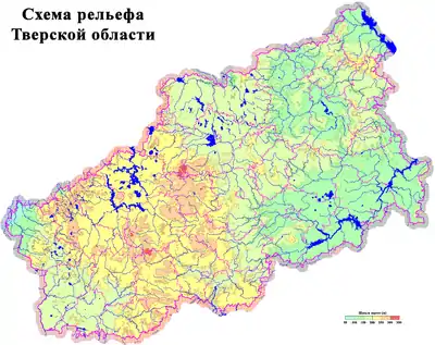 Для Тверской области в целом характерен равнинный рельеф с чередованием низменностей и возвышенностей. В западной части области, занимая примерно треть её площади, находится Валдайская возвышенность с высотами 200—300 м над уровнем моря. Она окружена понижениями, низины имеют высоты 100—150 м. Высшая точка области имеет высоту 347 м, расположена на Цнинской возвышенности (Макушка Валдая). Нижняя точка (61 м) — крайний северо-запад области, урез реки Кунья на границе с Новгородской областью.