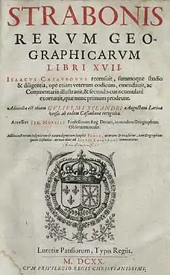 ![]() Титульный лист «Географии» в латинском переводе Ксиландера. Издание Казобона в перепечатке 1620 года | |