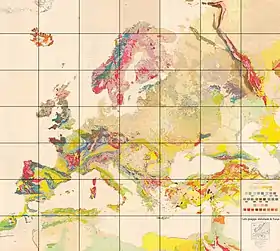 1710—1880 — начало региональных геологических исследований, составление мелкомасштабных полосовых карт и первых обзорных геологических карт. Первая геологическая карта для европейской части России (ещё не полная и в основном петрографическая) была составлена англичанином У. Странгвейсом в 1824 году[8]. К 1839 году были подготовлены обзорные геологические карты главных горных округов России; 1841 — карта Г. П. Гельмерсена[9]; 1845 — карта Р. И. Мэрчисона и Э. Вернейлья[10].