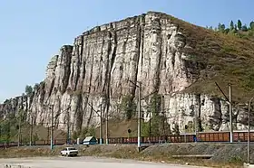 Скала сложена из чётко различимых вертикальных слоёв розовых и белых мергелистых аргиллитов. Высота скалы 80 м, протяжённость более 750 м. Скала имеет отвес в 75-80º и имеет очень живописный вид.
