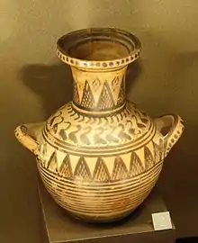 На сосудах геометрического периода исследователи обнаруживают несколько основных типов орнаментов. Часто изображались цепочки из ромбов, в центре каждого из которых находились точки, также были популярны изображения рядов зигзагов, нижние углы которых соединялись горизонтальной линией, что, тем самым, в сущности образовывало множество следующих друг за другом треугольников. Наносили и орнамент в виде нескольких параллельных друг другу рядов зигзагов. С помощью циркулей или гончарных кругов мастера наносили и композиции, состоящие из окружностей. Это могли быть опоясывающие сосуд линии различной толщины или повторявшиеся ряды концентрически расходящихся кругов. Примитивность геометрического стиля заключалась в строго прямолинейном нанесении узоров, которые по сути делили сосуд на секции с различным орнаментальными группами.
