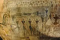 Некоторые элементы выведены с помощью циркуля из концентрически расположенных полукругов или кругов"[12]. Помимо окружностей, прямых и ломаных линий в подобных росписях встречаются геометризованные изображения человеческих фигур, животных, растений, солярные (окружность и ромб с точкой в середине) и водные («критская волна») знаки, а также треугольник, свастика, меандр, заполненный характерной косой штриховкой, шахматный узор, «ёлочки», зигзаг и образуемые им треугольники вершиной вверх и вершиной вниз.